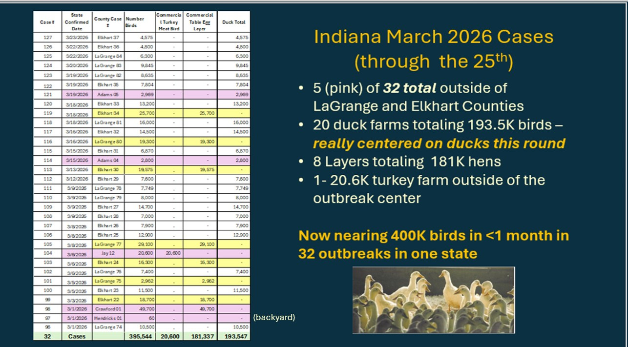 March will go down as the second most deadly month of the 25-26 season in total poultry losses but the worst month for the duck industry. The state has lost over a million layers in multiple “smaller” flocks and over half a million ducks, predominantly in 2 counties in north Indiana! (3/31 update - Indiana BOAH has subsequently reported 4 more infected duck flocks totaling 27,120 birds through March 31st)