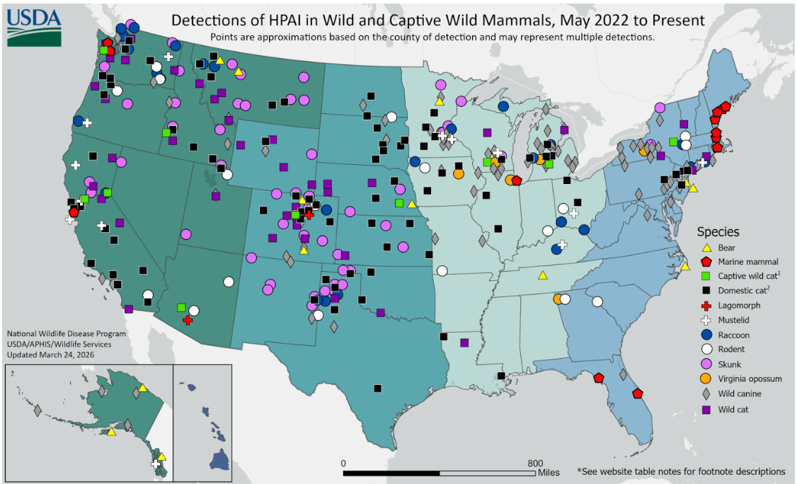 USDA has maintained a web site for some time now showing H5 isolates in “non-livestock” mammalian species in the U.S.: HPAI Detections in Mammals.