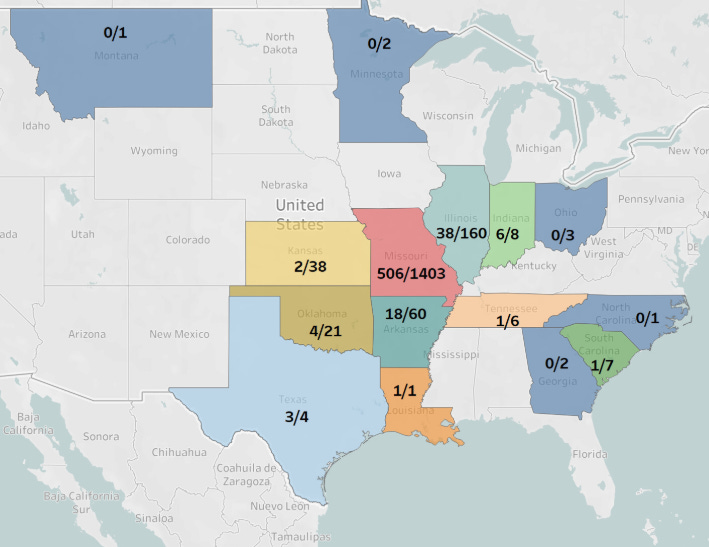 The results only reflect the time period sampled (January 2023-May 2024) and the areas from which the cattle were drawn (almost exclusively Missouri (1400+ samples), Illinois, Arkansas, Kansas, and Oklahoma-see map below). Lack of H5N1 titers is actually not surprising, given the May 2024 sample cut-off for a disease that first appeared in Texas in late March or early April 2024.