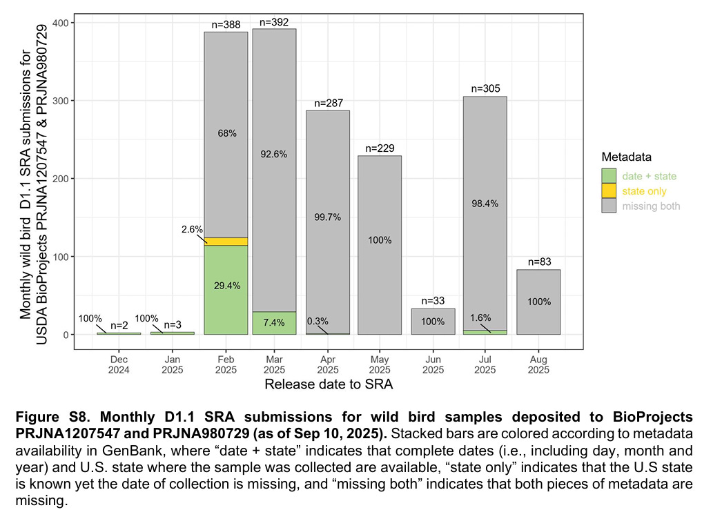 Back in the supplemental data, the preprint illustrates the lack of currency in assigning metadata to D1.1 wild bird samples, similar to the issues with the cattle, cats, and terrestrial mammals shown above: