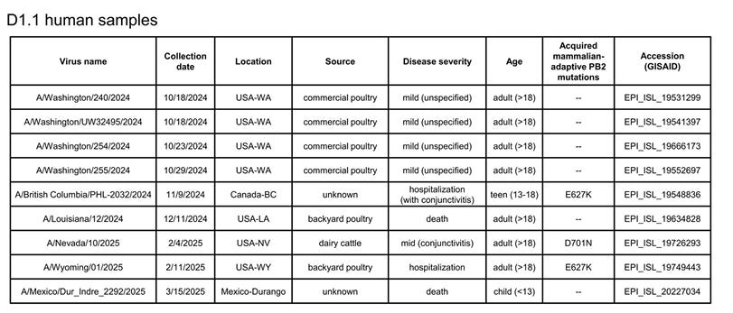 The preprint also contains a table of known D1.1 human cases reported through March 15, 2025, which is up to date, given the dearth of any recent reports of human infections with H5N1. The illness in Mexico City was reportedly due to an H5N2 infection with a predecessor 2022-2023 H5 2.3.4.4b gene, and the Washington fatality was diagnosed as a newly identified H5N5, briefly discussed in the preprint: