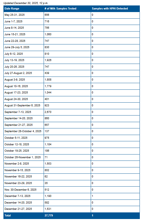 First, I want to congratulate Wisconsin for exemplary transparency in its milk sampling program! I’m not aware of any other major dairy states that post weekly milk sampling numbers and results. Here is the chart from their web site through December 30th: