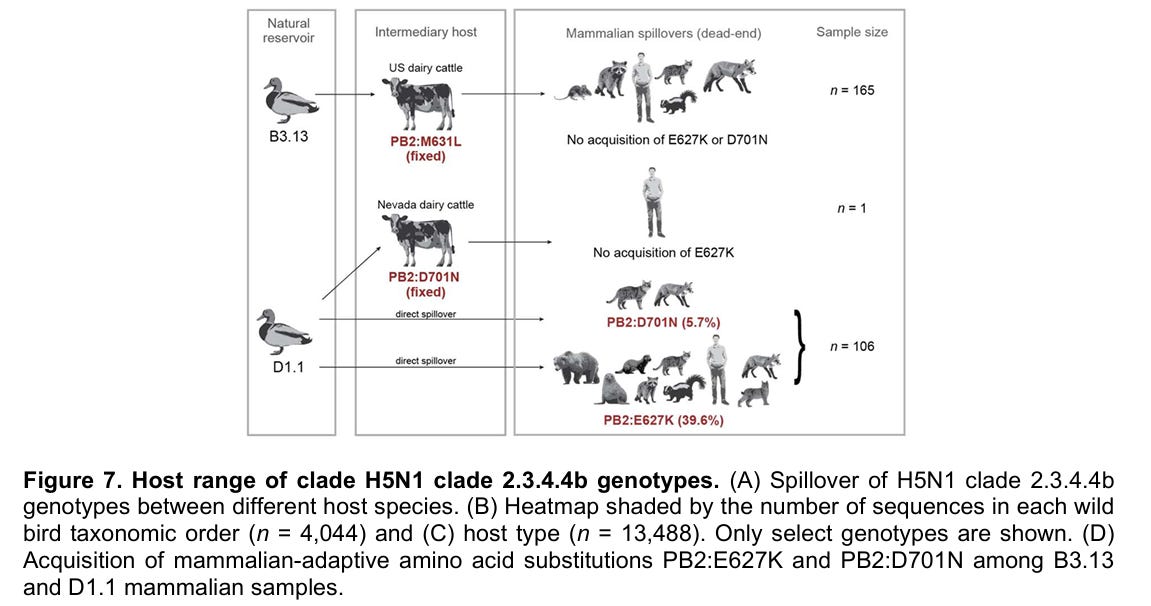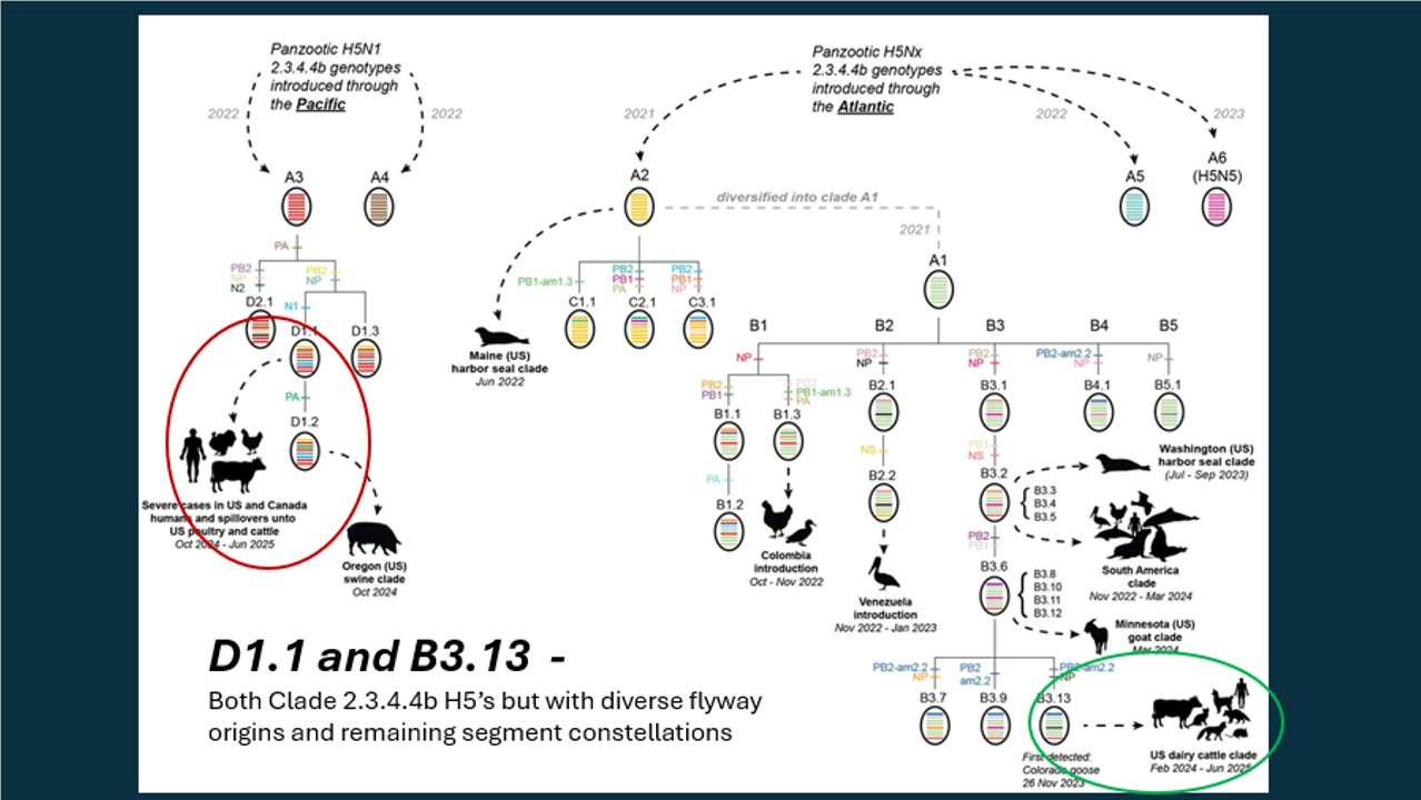 I was about to expand on some thoughts questioning whether we might be settling into an “endemic” situation with H5N1 in dairy where we’d all just slowly tolerate an increasingly lax testing protocol. B3.13 seems to be slowly dying out within the dairy population as within herd immunity to a well-adapted cattle virus may be smothering it while D1.1 seems to be a “non-problem” clinically for the dairy herds and non-reported as a worker health issue…