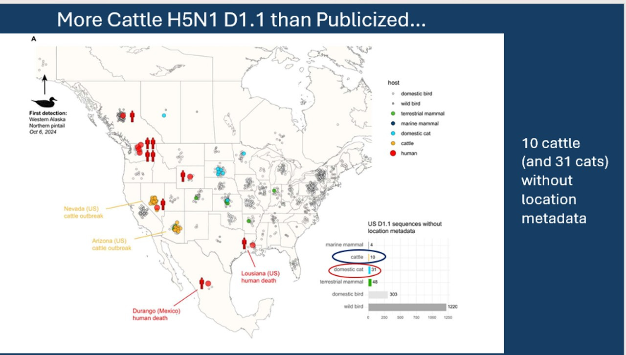 Remember that this case was detected in a state that is showing us their books! What about the many other states testing 50% of their herds monthly with no public transparency? What are the odds that we are finding all the D1.1 infected dairy herds in the U.S., given all the infected wildlife and poultry interspersed among dairy herds that seem to remain largely clinically asymptomatic with this strain of H5N1?